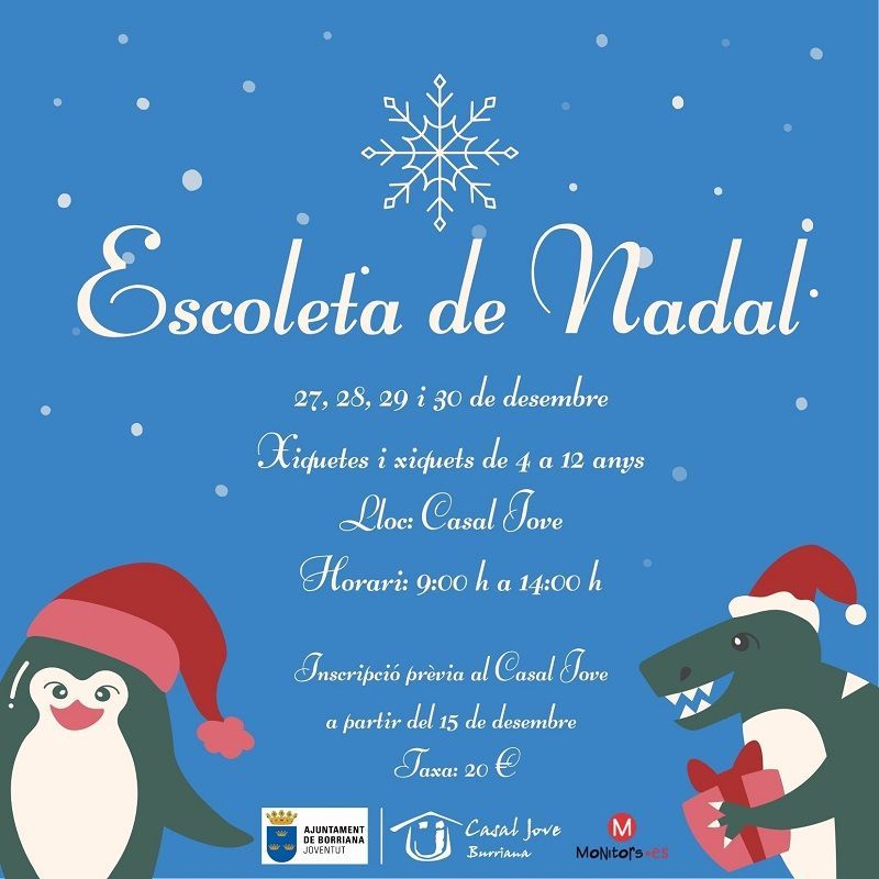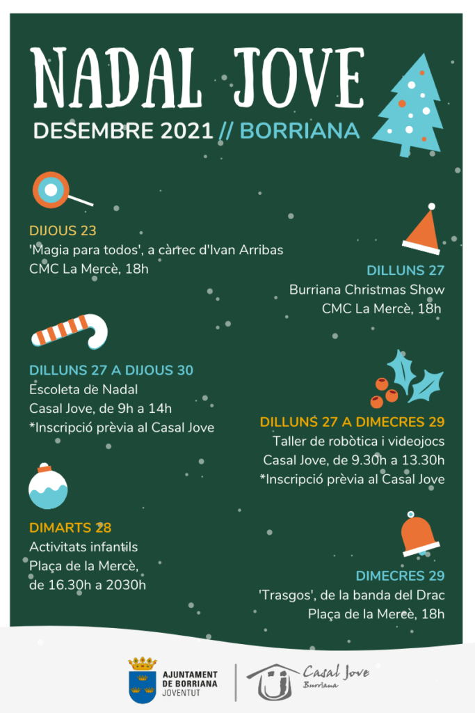 L’agenda d’activitats per a les famílies que ofereix l’Ajuntament de Borriana per a les festes nadalenques, a través de la Regidoria de Joventut que dirigeix Lluïsa Monferrer, inclou enguany una Escoleta de Nadal, espectacles infantils, màgia i un taller. Una programació municipal que s’uneix a les propostes culturals i de l’àrea de comerç impulsades pel consistori i anticipades a les previstes per a la benvinguda als Reis.