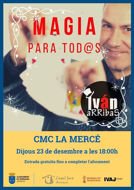 Les activitats per a les famílies del municipi preparades per Joventut s’estendran del 23 de desembre al 6 de gener, coincidint amb les vacances escolars, amb aforaments limitats i adaptades a les mesures sanitàries vigents. Així, el dijous 23 de desembre es podrà gaudir de l’espectacle gratuït de màgia Màgia per a tots, d’ Iván Arribas, a les 18h al CMC la Mercè, fins a completar l’aforament permès i amb les mesures sanitàries que estiguen en vigor en el moment de la celebració