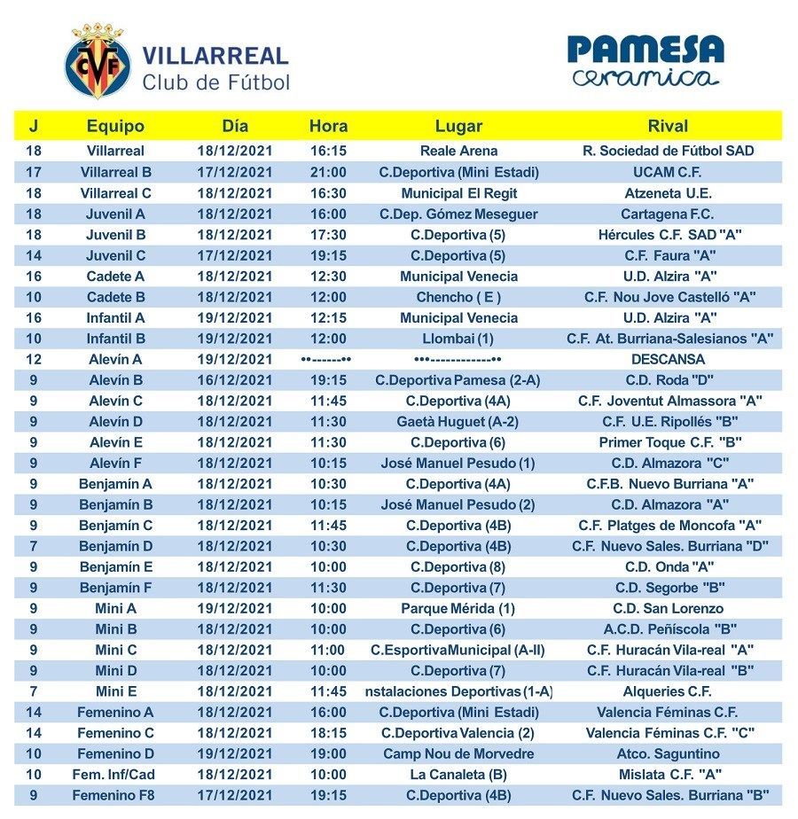 A continuación, puedes consultar todos los horarios de los partidos que jugarán los equipos del Villarreal CF esta jornada: