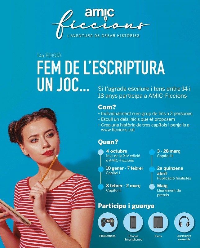 El funcionament El concurs “AMIC-Ficcions, l’aventura de crear històries” està enfocat a alumnes de 14 a 18 anys que cursin 2n cicle d’ESO, Batxillerat o Cicles Formatius de Grau Mitjà. L’objectiu principal d’aquesta iniciativa, creada per l’Associació de Mitjans d’Informació i Comunicació (AMIC), busca impulsar la creació literària i el treball en equip dels estudiants. Així com fomentar l’escriptura i la literatura en català. Prenent cinc inicis de novel·la: La memòria de l’arbre de Tina Vallès, Els desperfectes d’ Irene Pujadas, Com llàgrimes en la pluja de Jordi Sierra i Fabra, Asfíxia de Chuck Palahniuk i La filla del rei d’Hongria (autor anònim); els participants han d’escriure un relat dividit en tres capítols i penjar-los a través del web del concurs seguint el calendari d’entrega. Els alumnes podran participar tant individualment com en grup de fins a tres persones.