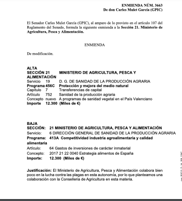 Carles Mulet García (GPIC) El Senador Carles Mulet García (GPIC), a l’empara del que es preveu en l’article 107 del Reglament del Senat, formula la següent esmena a la Secció 21. Ministeri d’Agricultura, Pesca i Alimentació. ESMENA De modificació. ALTA SECCIÓ 21 MINISTERI D’AGRICULTURA, PESCA I ALIMENTACIÓ Servei 19 D. G. DE SANITAT DE LA PRODUCCIÓ AGRÀRIA Programa 456C Protecció i millora del medi natural Capítol 7 Transferències de capital Article 752 Sanitat de la producció agrària Concepte nou A programes de sanitat vegetal al País Valencià Import 12.300 (Milers de €) BAIXA SECCIÓ: 21 MINISTERI D’AGRICULTURA, PESCA I ALIMENTACIÓ Servei: 6 DIRECCIÓ GENERAL DE SANITAT DE LA PRODUCCIÓ AGRÀRIA Programa: 413A Competitivitat indústria agroalimentària i qualitat alimentària Article: 64 Despeses d’inversions de caràcter immaterial Concepte: 2017 21 22 0040 Estratègia aliments d’Espanya Import: 12.300 (Milers de €) Justificació: El Ministeri d’Agricultura, Pesca i Alimentació col·labora ben poc en la lluita contra les plagues en aquesta autonomia, per la qual cosa plantegem una col·laboració amb la Conselleria d’Agricultura en aquesta matèria.