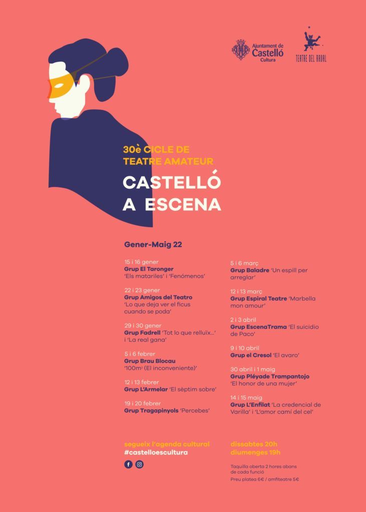 Aquest 2022, el Castelló a Escena s’engega amb El Taronger, que presentarà els dies 15 i 16 de gener ‘Els Matariles’, de Manuel Soto; i ‘Fenómenos’, de Lluis Juan , dos peces recuperades dins la retrospectiva del grup, dirigides per Santi López ; y Amigos del Teatro, amb una obra original del seu director, Antonio Arbeloa, ‘Lo que deja ver el ficus cuando se poda’, que es representarà el següent cap de setmana, 22 i 23 de gener. Per a tancar el mes, el Grup Fadrell fa seu el sainet més tradicional amb ‘Tot lo que relluïx…’, de Paco Barchino; i ‘La real gana’, en versió del mateix autor, els dies 29 i 30, sota la direcció de Joan Prades.