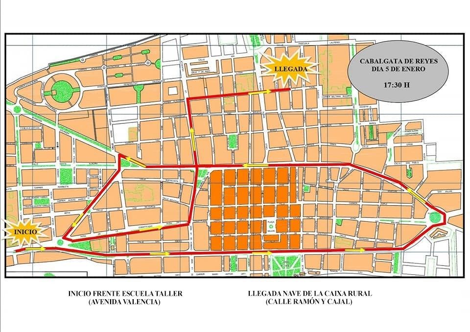 De manera que, la caravana real eixirà de l’edifici de l’antic escorxador on es troba el Taller d’Ocupació, ubicat a l’avinguda de València, a les 17.30 hores del dia 5 de gener i recorrerà diferents avingudes i carrers del municipi fent un recorregut total de cinc quilòmetres, quan en anys anteriors l’itinerari era de 900 metres. Per tant, recorrerà l’avinguda de València, l’avinguda de Castelló, la plaça del Pilar , carrer de la Puríssima, carrer de Santa Bàrbara, carrer de Sant Bartomeu, l’avinguda de la Diagonal, l’avinguda de la Constitució, el carrer Pare Tomàs Lucas, la carretera de la Vilavella i el carrer Ramon i Cajal, fins al magatzem de la Caixa Rural Sant Josep de la localitat.