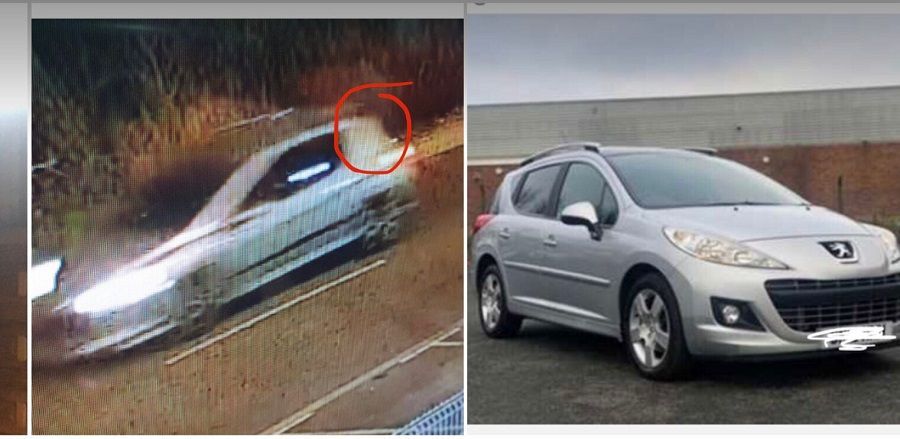 Por las imágenes de las cámaras de seguridad de la zona podría ser un Peugeot 208 Ranchera (derecha de la fotografía), de color gris con un cartón o similar en la ventanilla trasera izquierda, como muestra la imagen de la izquierda. Tras el accidente el coche presentaría un fuerte golpe en el frontal y lateral derecho con posible pérdida del retrovisor de ese lado.