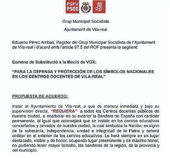 La aparición en redes sociales de un comunicado del PSPV de Vila -real, solicitando a los centros docentes de la ciudad la obligatoriedad de la presencia de la bandera nacional en sus edificios, ha levantado algunas críticas. La polémica no ha venido por el comunicado en sí, sino porque en ese comunicado el logo del PSOE aparece en su cabecera junto a los de Unides Podem y Vox. Ante este hecho el PSPV de Vila -real no ha tardado en calificar de «manipulación» lo sucedido con el documento publicado, ya que en el escrito original no aparecen los tres logos juntos, aunque el texto es exactamente el mismo.