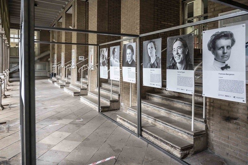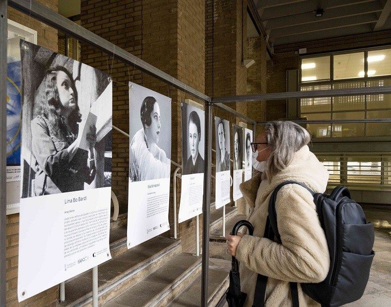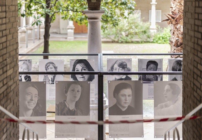 En primer lugar y siguiendo esta línea reivindicativa se ha instalado en el claustro del centro, entre las columnas renacentistas que dan acceso a la entrada principal, una estructura metálica que contrasta con la naturaleza del propio claustro, formando una especie de pasaje que obliga al espectador a transcurrir por él. En sus paredes laterales, una serie de rostros femeninos detienen sus miradas en quien transita. Se trata de diseñadoras que se hacen visibles para toda persona que pasa, que se detiene a observarlas y, de algún modo, incluso, a descubrirlas. Esta actividad ha contado con la colaboración de distintos centros educativos de la provincia de Castellón, que han materializado desde sus aulas y de manera creativa, un homenaje a esas mujeres. Junto al rostro de cada una de ellas es visible un código QR que, al escanearlo, dirige al público al trabajo realizado en las aulas de los institutos, así como a una breve descripción biográfica de cada diseñadora.