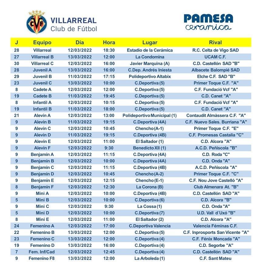 A continuación, puedes consultar todos los horarios de la jornada para los conjuntos del Villarreal CF: