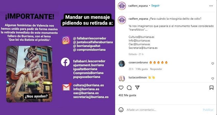 Siga com siga, el grup Radfem España ha iniciat una campanya que pretén la retirada del monument.