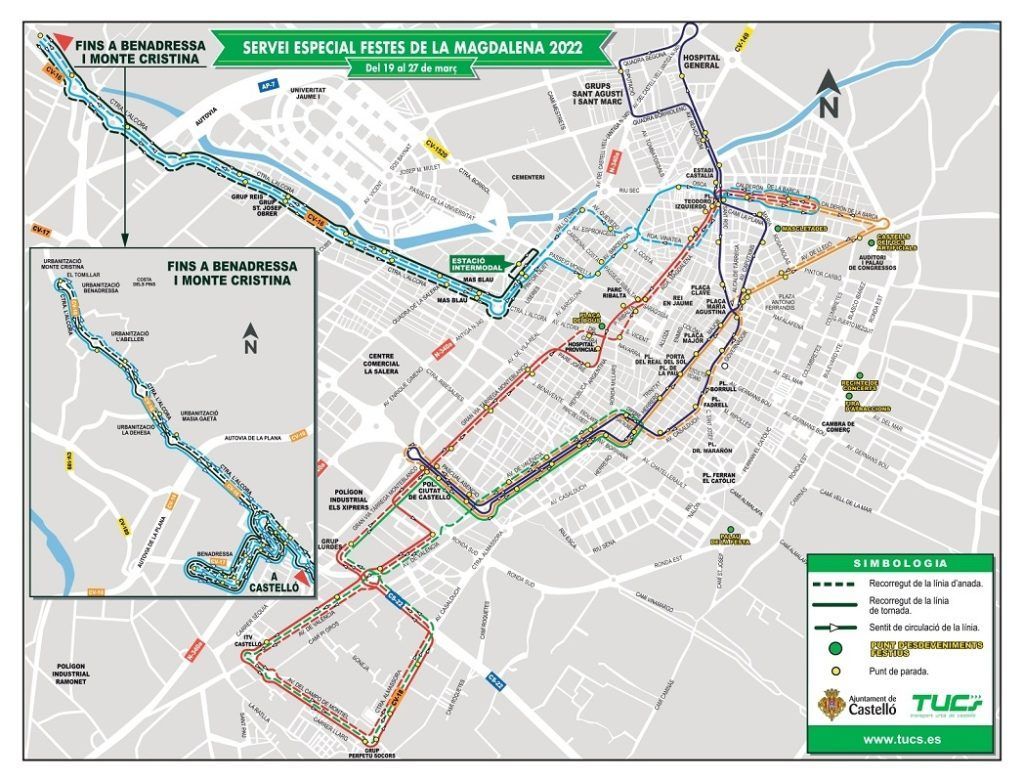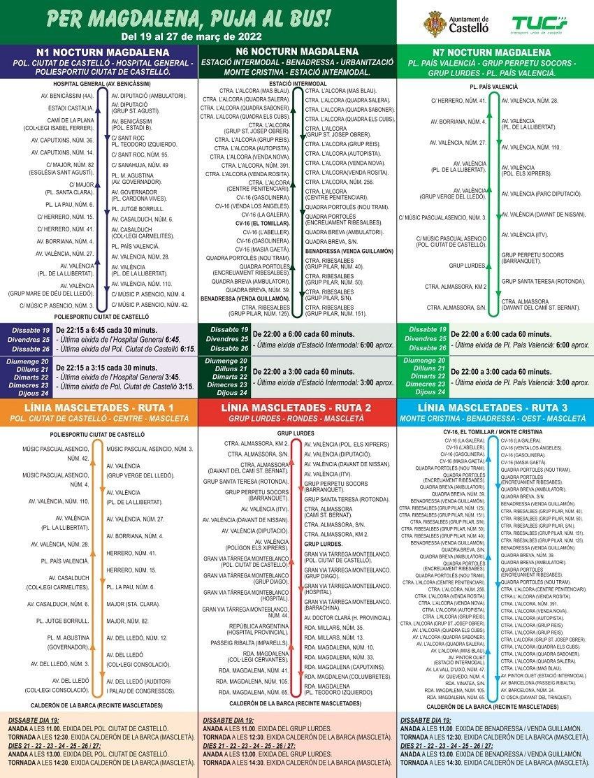 El servei especial nocturn estarà actiu del 19 al 26 de març, amb dues noves rutes nocturnes que se sumaran a la N1 Ciutat de Castelló-Hospital General que ja funciona de manera regular. Aquestes dues noves línies nocturnes (N6 Estació Intermodal-Benadressa-Monte Cristina i N-7 Plaça País Valencià-Grup Perpetu Socors-Grup Lurdes) permetran ampliar la connexió del transport públic a urbanitzacions de muntanya de la carretera de l’Alcora i grups perifèrics del districte Sud. El dissabte 19, el divendres 25 i el dissabte 26, l’horari de la N1 serà de 22.15 a 6.45 hores cada 30 minuts; i el de la N6 i la N7, de 22.00 a 6.00 hores cada 60 minuts. El diumenge 20, el dilluns 21, el dimarts 22, el dimecres 23 i el dijous 24, la N1 funcionarà de 22.15 a 3.15 hores cada 30 minuts; i la N6 i la N7 de 22.00 a 3.00 hores cada 60 minuts.