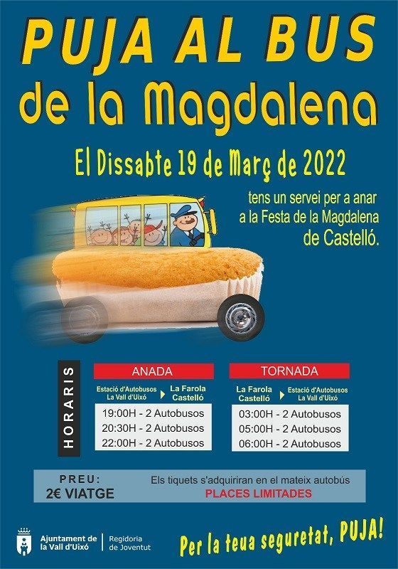 La Concejalía de Juventud del Ayuntamiento de la Vall d’Uixó pone a disposición de la ciudadanía un servicio de autobuses para desplazarse a las Fiestas de la Magdalena este sábado 19 de marzo. Esta es una iniciativa que se estrenó en 2016 y salvo por el parón de la pandemia “se ha organizado desde entonces para garantizar la seguridad en una noche que puede ser peligrosa en la carretera”, ha explicado el concejal del área, David Lluch.