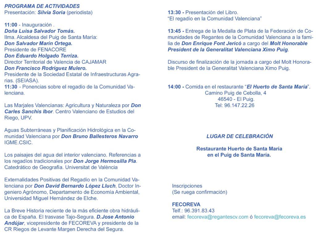 Durante la jornada el president de la Generalitat Valenciana, Ximo Puig , entregará la Medalla de Plata de la Federación de Comunidades de Regantes de la Comunitat Valenciana a la familia de Enrique Font Jericó.