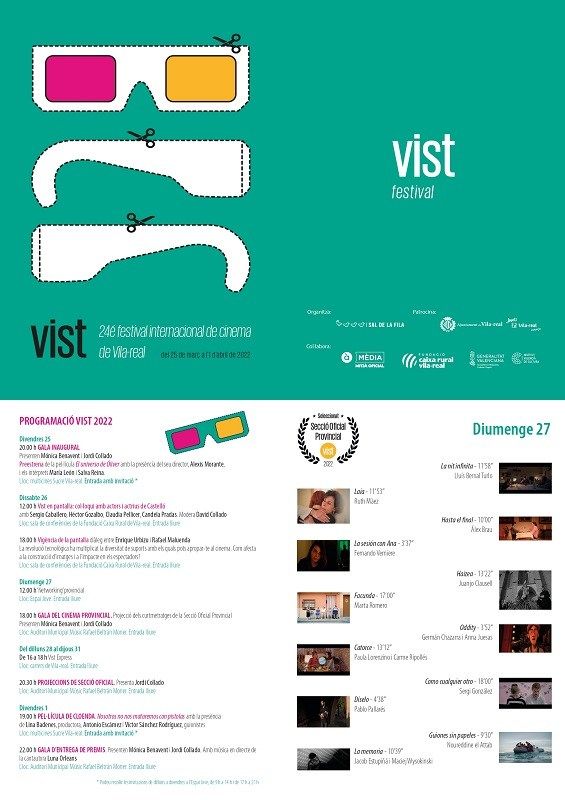 VIST, el Festival de Cinema de Vila -real organitzat per l’Associació Sal de la Fila i patrocinat per l’Ajuntament de Vila -real, inicia la seva 24 edició aquest divendres amb un programa d’activitats en el qual es donen la rajo preestrenes cinematogràfiques, taules rodones, xerrades, projeccions, rodatges amb els més joves i un major protagonisme del sector audiovisual de Castelló.