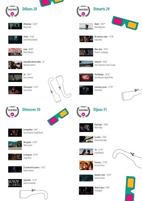 De dilluns a dijous tindrà lloc l’activitat VISTExpress en la qual els joves de diversos centres de secundària prendran els carrers de la localitat per a gravaran i editaran els seus curtmetratges que es projectaran en el lliurament de premis del dia 1. I a les 20.30 hores, a l’Auditori Municipal i amb entrada lliure, tindran lloc les sessions de projecció dels 23 curts seleccionats en la secció oficial. I intensa serà la jornada de cloenda. L’1 d’abril es preestrenará una altra pel·lícula, nouvinguda del Festival de Màlaga i rodada a cavall entre Castelló i València: Nosotros no nos mataremos con pistolas. En aquest cas, VIST comptarà amb la presència d’una de les productores del film, Lina Badenes, i els guionistes Toni Escámez i Víctor Sánchez Rodríguez . La projecció tindrà lloc en els multicines Sucre, a partir de les 19.00 hores. Gairebé sense temps per a descansar, el festival donarà pas a la gala de lliurament de premis, a les 22.00 hores, a l’Auditori Municipal, amb la música en directe de la cantautora Luna Orleans.