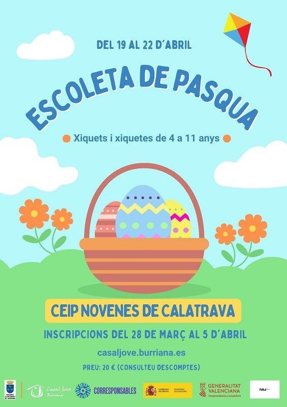 La Pasqua està molt a prop, i l’Ajuntament de Borriana ha obert el període d’inscripció per a l’Escoleta de Pasqua del 19 al 22 d’abril per a xiquets i xiquetes de 4 a 11 anys, un pla perquè dediquen part del temps lliure a activitats lúdiques i esportives.