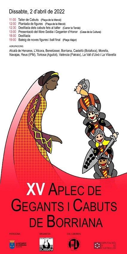 Dissabte que ve 2 d’abril arriba la XV edició de l’Aplec de Gegants i Cabuts de Borriana. Una data trasllada des de les festes de Sant Blai per a poder acollir a les dotze colles que arriben enguany a la capital de la Plana Baixa, amb la sorpresa aquest any del bateig de tres figures més que se sumen a la Colla de Gegants i Cabuts de Borriana a partir d’aquesta trobada.