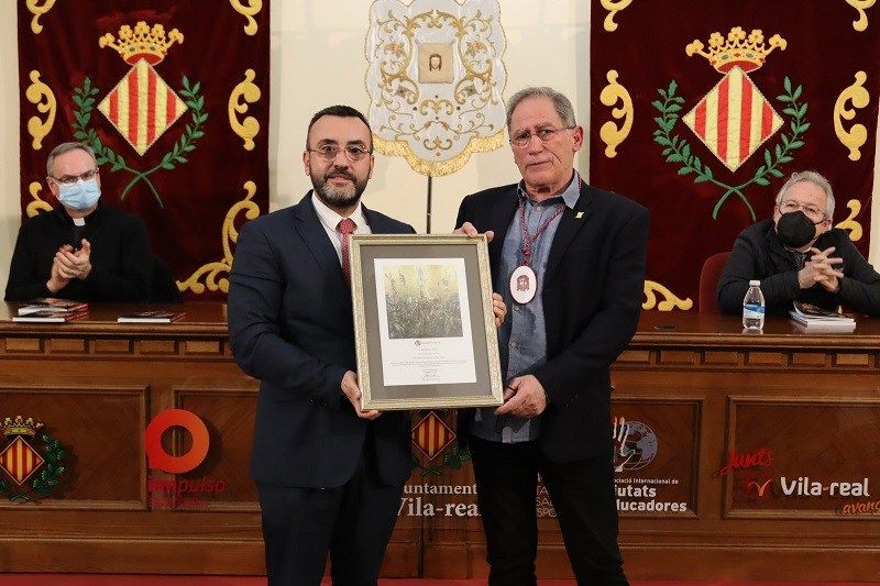 Imatges de la presentació del llibre commemoratiu del 75é aniversari de la Germandat de la Santa Faç. La presentació del llibre ha estat a càrrec de Fernando Peris , autor del pròleg, i ha comptat amb la participació del rector de l’església Arxiprestal, Javier Aparici, el Germà Major de la Santa Faç, Benjamín Gil , i l’alcalde de la ciutat, José Benlloch, qui ha destacat el fort arrelament de la germandat a la ciutat i la seua contribució a engrandir la Setmana Santa de Vila -real. Benlloch ha lliurat a Benjamín Gil una al·legoria de la fundació de la ciutat, en reconeixement a la trajectòria de l’entitat. A més, durant l’acte, també s’ha homenatjat a la família Mezquita Llorens, per la seua forta vinculació a la Germandat de la Santa Faç.