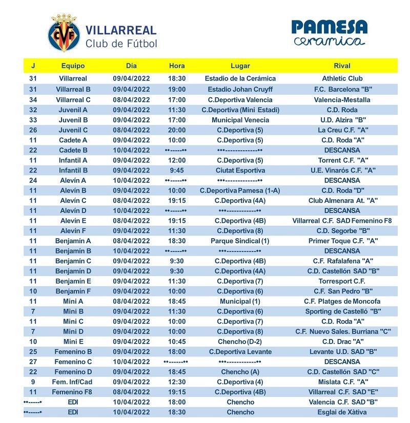 A continuación, puedes consultar todos los horarios de los partidos que jugarán los equipos del Villarreal CF este fin de semana: