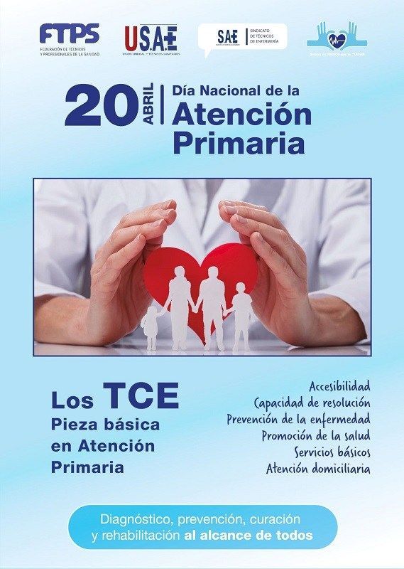 Con motivo del Día Nacional de la Atención Primaria, hemos distribuido un cartel por los centros de salud, destacando el papel de nuestro colectivo en este nivel asistencial, donde participamos como apoyo en las funciones realizadas por el resto del personal sanitario, en la elaboración del diagnóstico de salud, o en la planificación, organización y evaluación de los programas, como el de Educación para la Salud, tanto en el ámbito ambulatorio como en la atención domiciliaria; pero también, dentro de estos equipos, los TCE colaboramos en la prevención de la enfermedad o en la promoción de la salud, así como en la atención a los pacientes y en la aplicación de tratamientos y rehabilitación de las secuelas dejadas por la enfermedad. Además, somos un colectivo esencial en la atención al enfermo crónico y, con una población cada vez más envejecida, estas patologías aumentan día a día, convirtiéndonos en los profesionales más importantes en su atención.