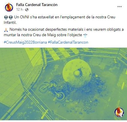 Varias horas después, tras especulaciones, comentarios y chascarrillos varios, el misterio se resolvía. El autor del supuesto artefacto es el artista burrianense Juan Poré, de la Falla Cardenal Tarancón, y el objeto, con toda su puesta en escena, forma parte de la participación de la falla en las Cruces de Mayo de Borriana, que se celebran durante este fin de semana en el municipio. Concretamente el OVNI pertenece a la cruz infantil que va a plantar la comisión hoy viernes.