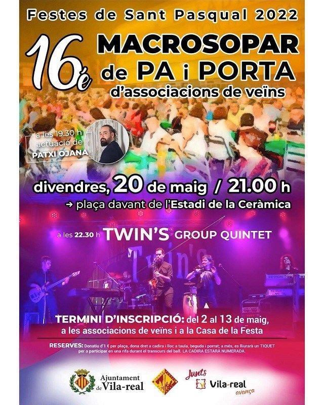 Després de dos anys de pandèmia, les festes de Sant Pasqual recuperaran el pròxim 20 de maig, a les 21.00 hores, el popular Macrosopar de veïns; una cita multitudinària promoguda per la Regidoria de Participació Ciutadana i la Junta de Festes, en col·laboració amb les associacions de veïns i Acudim, que espera convocar al voltant de 2.500 persones a la plaça de l’Estadi de la Ceràmica. La regidora de Participació, Miriam Caravaca, s’ha reunit amb les entitats per a preparar la cita, que es va celebrar per última vegada al setembre de 2019. Aquesta serà la 16a edició.