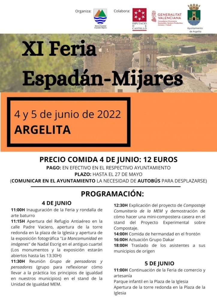 El Día de la Mancomunidad Espadán Mijares se celebrará este sábado, 4 de junio, en Argelita, junto a la XI Feria del comercio y turismo comarcal, que este año se ampliará también al domingo.