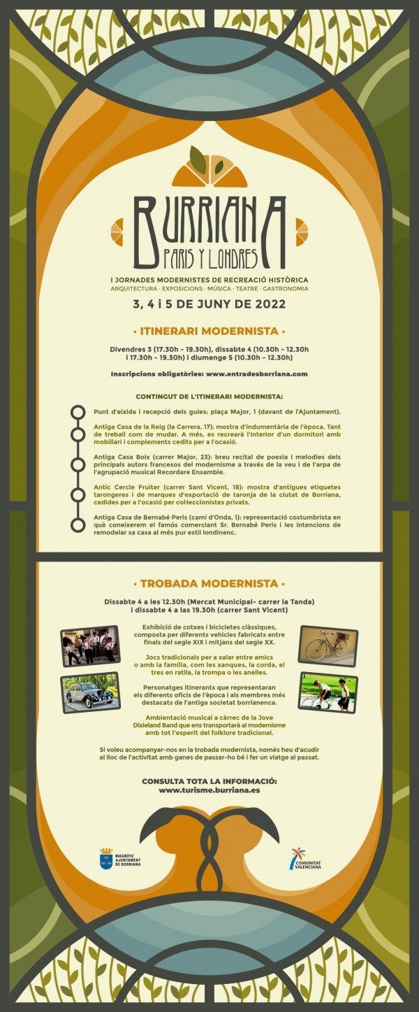 Durant tres dies, Borriana es convertirà en un plató modernista amb una gran varietat d’activitats lúdiques i culturals per tota la localitat. Comptarà, així, amb propostes divulgatives, com ara exposicions, recitals, visites guiades, teatralitzacions, trobades amb personatges i ambientació musical.
