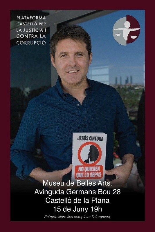 El periodista Jesús Cintora, presentador de diversos programes de gran audiència de televisió i radio, oferirà una conferencia en Castelló, el dimecres dia 15 de juny a les 19 hores, invitat per la Plataforma Castelló per la Justicia i contra la Corrupció, una entitat castellonenca sense ànim de lucre i que no percep cap tipus de subvenció per no minvar la seua llibertat d’acció, creada l’any 2017.