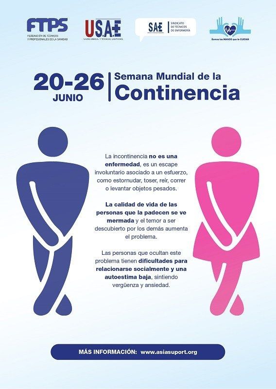El Sindicato de Técnicos de Enfermería (SAE) se suma a la Semana Mundial de la Continencia con un cartel que quiere concienciar a la población sobre un problema que afecta aproximadamente a 10 millones de personas en España, de los que la mitad lo sufren en silencio debido al estigma social que produce. Así, por ejemplo, el número de pacientes que viven con incontinencia fecal en nuestro país se sitúa entre los dos y los cuatro millones, un horquilla especialmente amplia debido a que menos del 30% de quienes la padecen consulta a su médico.