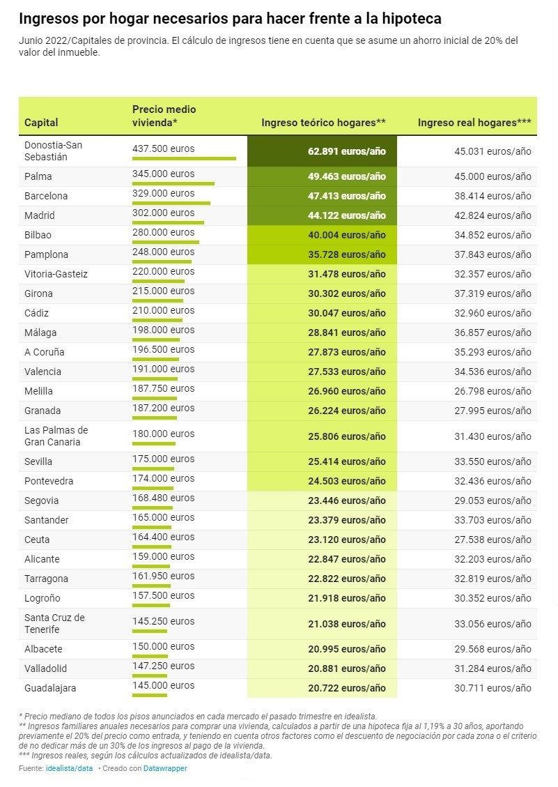 idealista ha analizado el mercado de la vivienda por capitales de provincia en el último trimestre (el precio mediano de todos los pisos anunciados en ese periodo en la plataforma) y ha elaborado un estudio en el que ofrece los ingresos familiares anuales necesarios para comprar una vivienda, calculados a partir de una hipoteca fija al 1,19% a 30 años, aportando el 20% del precio como entrada, teniendo en cuenta también el descuento de negociación por zonas, y manteniendo el criterio de los principales organismos económicos que aconsejan destinar, como máximo, un tercio de los ingresos a los gastos destinados a la vivienda.