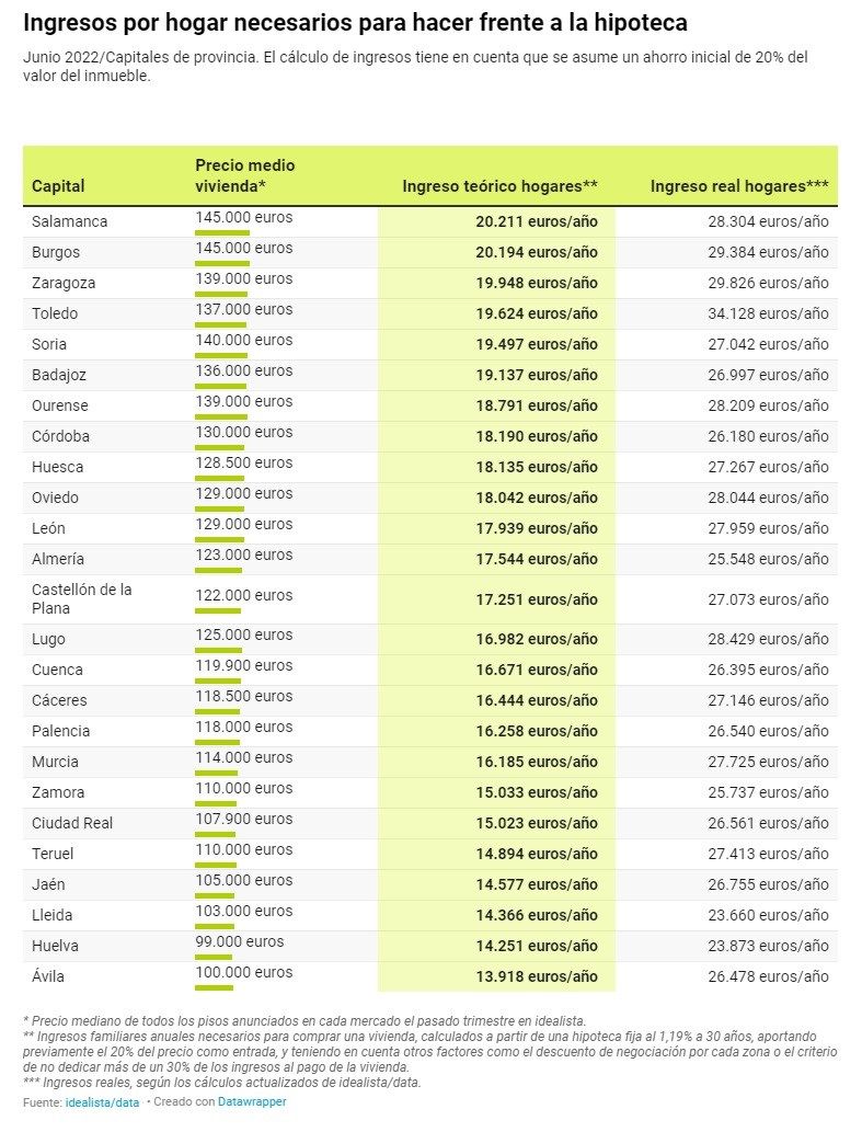 Capitales como Ávila, Huelva o Lleida son las cuidades donde se necesitan unos ingresos anuales más bajos para poder hacer frente al pago de la hipoteca si un hogar tuviera que hacer frente a la compra de una vivienda al precio mediano actualmente ofertado en idealista. Con los actuales ingresos medios por hogar de 26.478 euros/año, 23.873 euros/año y 23.660 euros/año, respectivamente, es suficiente para comprar un piso mediano de 100.000 euros, 99.000 euros, y 103.000 euros, respectivamente, y asumir la cuota mensual. Y es que el saldo teórico en cada una de ellas sería de 13.918 euros/año, 14.251 euros/año y 14.366 euros/años.