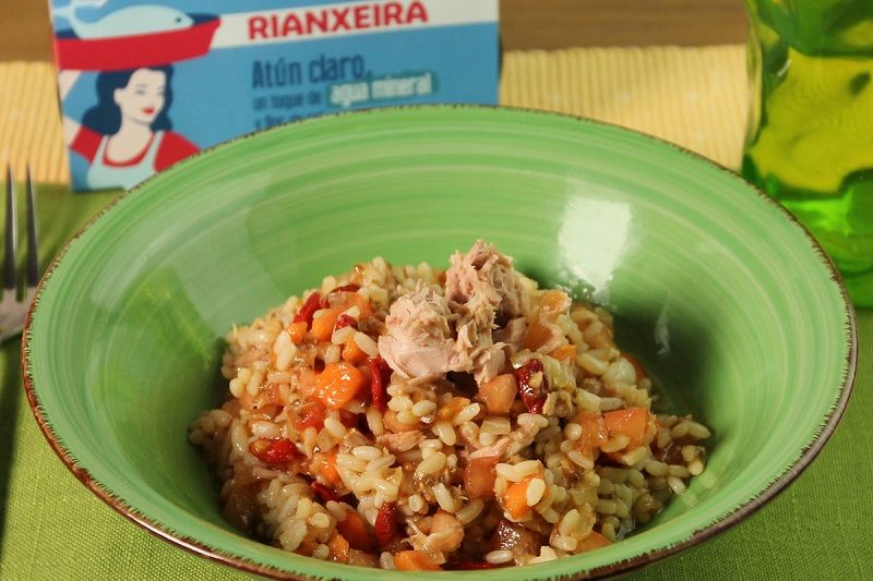 - Añadir los ingredientes en este orden: tomate, cebolla, papaya, arroz cocido, las bayas de Goji y, finalmente, el atún de Rianxeira