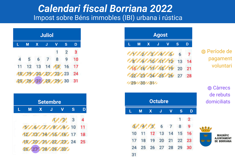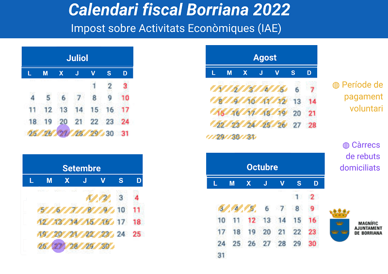 • Des del 15 de juliol al 5 d’octubre, per a abonar l’Impost sobre Béns immobles (IBI) urbana i rústica i del 25 de juliol al 5 d’octubre l’Impost sobre Activitats Econòmiques (IAE)