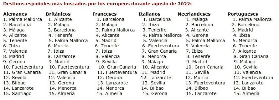 Jetcost.es analiza regularmente las búsquedas que se realizan a través de su web, de manera que se consiguen datos muy fiables, al tratarse de búsquedas reales y no de encuestas. Los datos que analizan los resultados de búsquedas de vuelos durante el mes de agosto de 2022, indican que, una gran mayoría se ha decantado por La Comunidad Valenciana, y dentro de ella, Alicante es la ciudad más solicitada por los viajeros británicos, la tercera por los neerlandeses, la cuarta por los alemanes y franceses, la séptima por los portugueses y la décima por los italianos.