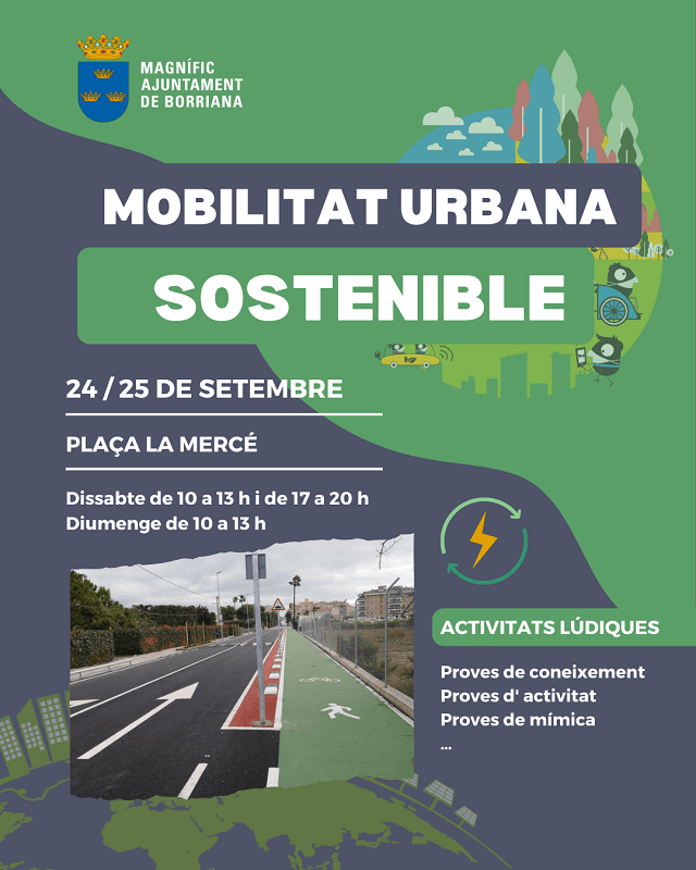 L’Ajuntament de Borriana proposa una campanya de sensibilització de mobilitat urbana sostenible dins de la Setmana Europea de Mobilitat que se celebra la setmana que ve. A Borriana, la campanya es realitzarà a través d’una activitat lúdica prevista per al dissabte 24 de setembre de 10h a 13h i de 17h a 20h i el diumenge 25 de 10h a 13h a la plaça de la Mercè.