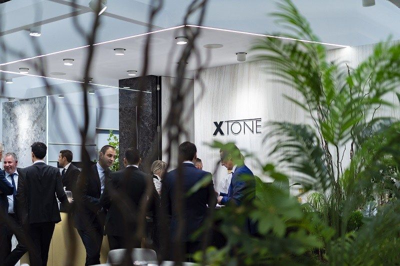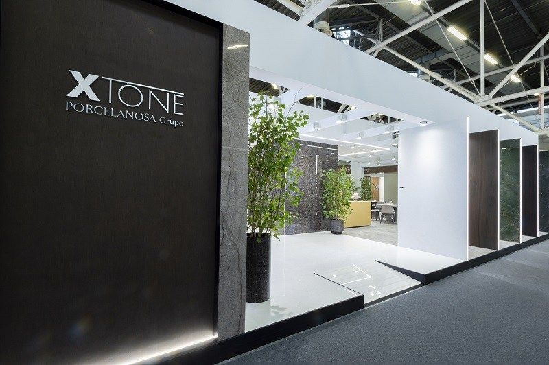 La distribución de zonas permite conocer las principales novedades de la marca, como Steel, Montreal Ice o las nuevas colecciones Ewood: Nut o White. El visitante descubre los marmoleados más representativos de XTONE a través de unas columnas giratorias.