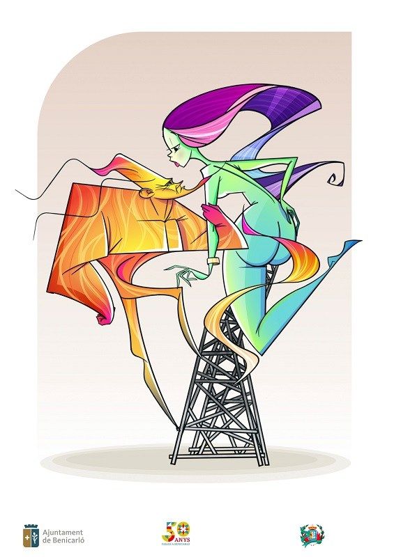 El cartell anunciador de les Falles 2023 ha estat una creació de Pistacho Studio. La imatge representa amb icones els aspectes més reconeixibles de les falles benicarlandes com la mascletà, les pintes de les falleres, els sopars d’entrepà o els casals, d’entre altres.