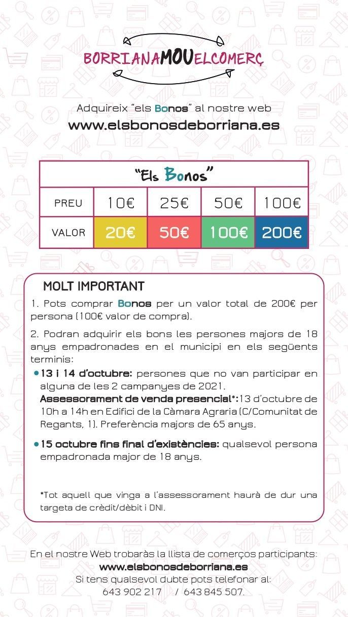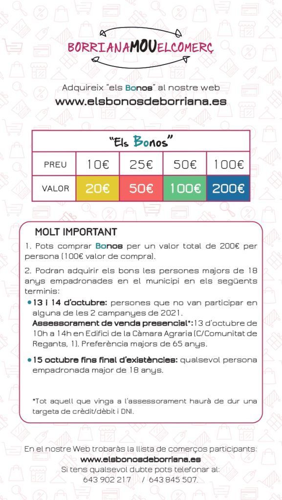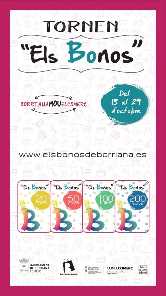 En aquesta ocasió l’Ajuntament també posarà en circulació bons de 20, 50, 100 i 200 euros, subvencionats al 50% per als veïns i veïnes de Borriana que seran canviables per a gastar en les botigues de proximitat i l’hostaleria local adherits a la campanya.
