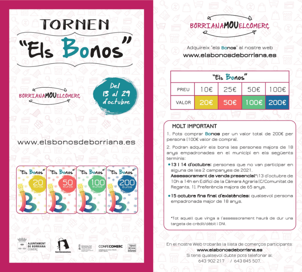 - Tornen els bons descompte, es poden adquirir en la web <www.elsbonosdeborriana.es> per a gastar en el comerç, en alimentació i en l’hostaleria local