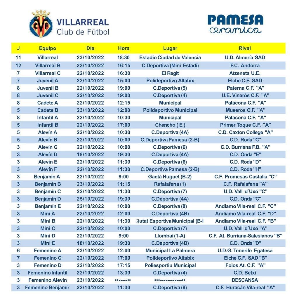 Los equipos del Villarreal CF ya conocen los horarios para los encuentros que disputarán este fin de semana. Un total de 15 conjuntos amarillos ejercerán como anfitriones en la presente jornada.