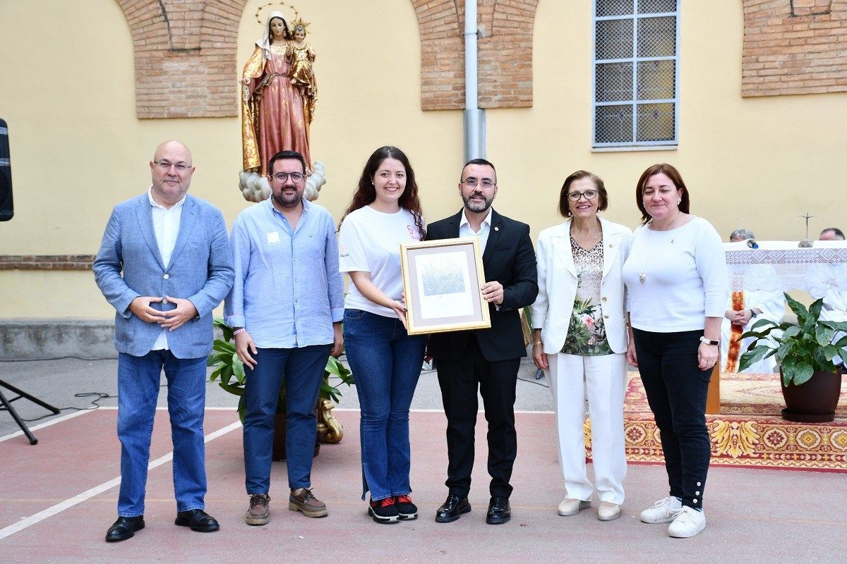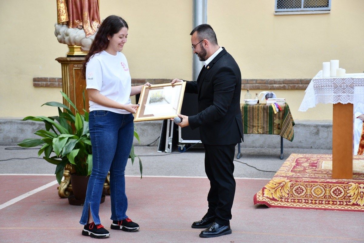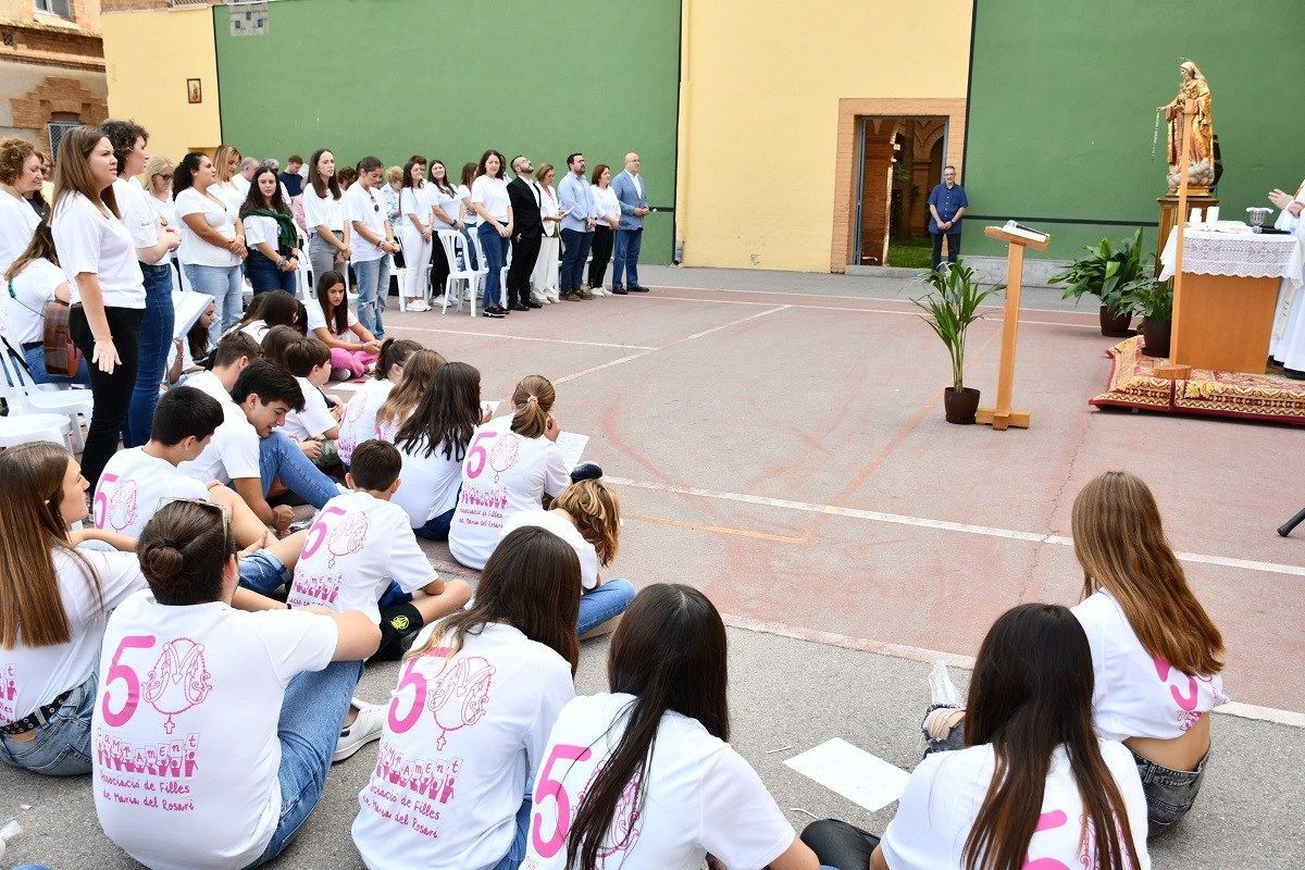 Imatges de la commemoració del 50é aniversari dels campaments d’estiu de l’Associació de Filles de Maria del Rosari que va tenir lloc ahir amb una eucaristia al pati del col·legi Carmelites. L’alcalde de la ciutat, José Benlloch, ha assistit a la celebració, juntament amb altres regidors i regidores de l’Ajuntament, i ha lliurat a la presidenta del Rosari, Cristina Pesudo, una al·legoria de la ciutat amb motiu d’aquest aniversari i en reconeixement per la tasca cultural i social que desenvolupa l’associació i el seu treball per mantenir vives les tradicions locals.