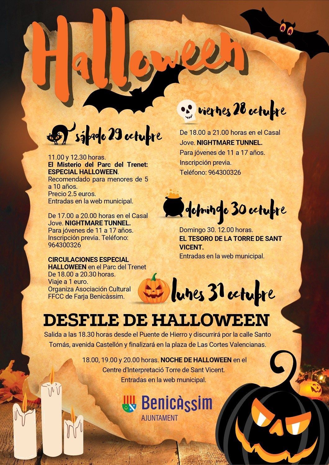 El dissabte 29 hi haurà programació durant tota la jornada i el Parc del Trenet serà el primer espai que aculla activitat. Els menors d’entre 5 i 10 anys podran participar de manera activa en l’activitat El Misteri del Parc del Trenet, amb una edició especial Halloween, en algun dels dos passes programats, a les 11.00 i a les 12.30 hores i les entrades a un preu de 2,5 euros es poden adquirir en la web municipal. A la vesprada, serà de nou el torn dels joves que podran gaudir d’un nou passe del Túnel del Terror en el Casal Jove de 17.00 a 20.00 hores i el Parc del Trenet tornarà a acollir activitat, però en aquest cas seran les circulacions de trens organitzades per l’Associació Cultural FFCC de Farja Benicàssim les que estaran ambientades en la festa d’Halloween.