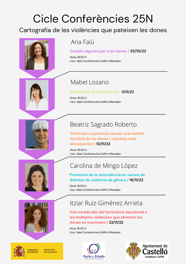 La Regidoria de Feminisme i LGTBI de l’Ajuntament de Castelló ha dissenyat un complet cicle de conferències al voltant de la violència masclista, emmarcat en els actes del 25N sota el títol ‘Cartografia de les violències que pateixen les dones’. S’han programat cinc jornades amb activistes i especialistes de primer nivell que abordaran temàtiques diferents sobre les violències que pateixen les dones. A Ana Falú, se sumen la directora de cinema i activista a favor de l’abolició de la prostitució Mabel Lozano , l’investigadora sobre trata i discapacitat Beatriz Sagrado, la jurista Carolina de Mingo i l’experta en drets humans i migracions Itziar Ruiz -Giménez .