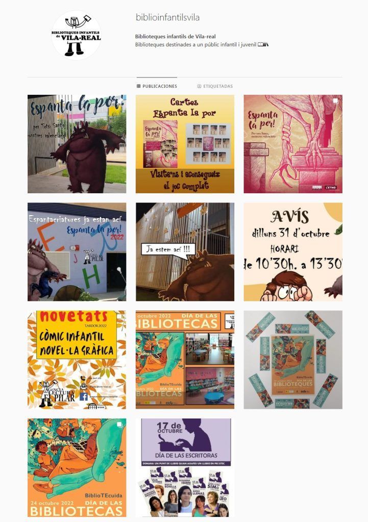 Las bibliotecas infantiles de Vila -real han aumentado su oferta en las redes sociales. Desde mediados de octubre se ha puesto en marcha una cuenta conjunta en Instagram con el objetivo de difundir las actividades culturales y de animación a la lectura, novedades literarias, efemérides, horarios, etc. No es la primera vez que las bibliotecas infantiles utilizan las redes sociales para divulgar eventos y actos, ya que, además de la página de internet del Servicio Municipal de Bibliotecas de Vila -real, cada una de ellas dispone de manera individual de una cuenta en la red Facebook. Así pues, con la apertura de una cuenta en Instagram, apoyada fundamentalmente por imágenes y vídeos, las bibliotecas infantiles se han unido en esta red social con el propósito de llegar a un mayor número de usuarios y potenciales seguidores gracias a una mayor visibilidad de sus actividades bibliotecarias.