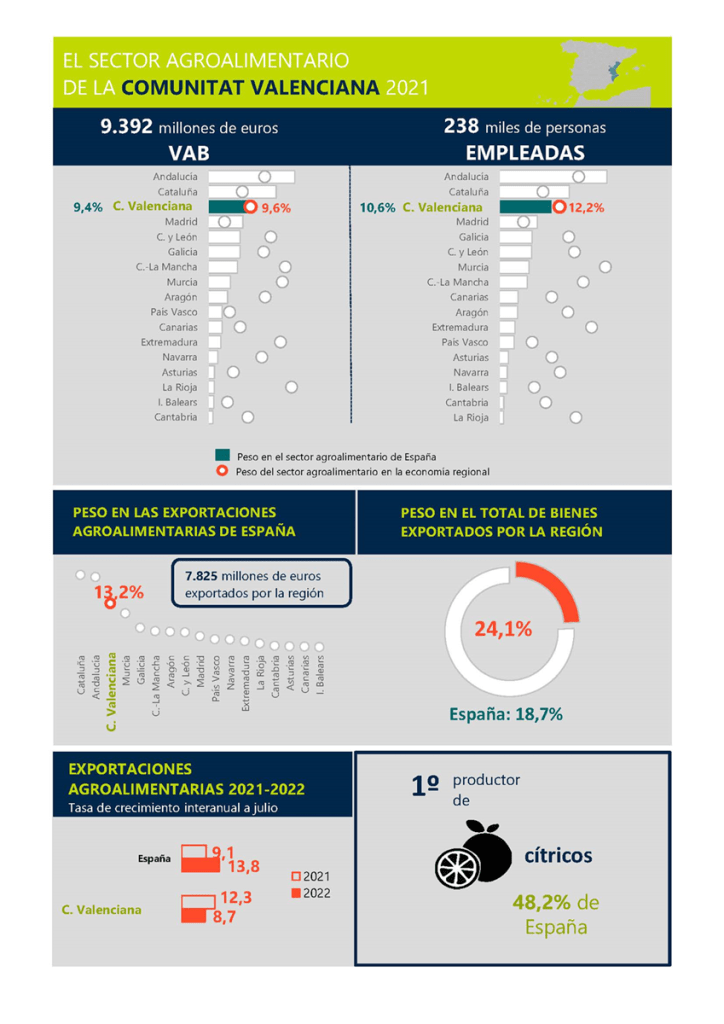 - En 2021, el sector agroalimentario de la Comunitat Valenciana generó 9.392 millones de euros de VAB, lo que supone el 9,6 % de la economía regional, y empleó a 237.848 personas, el 12,2 % del total de ocupados en la región.