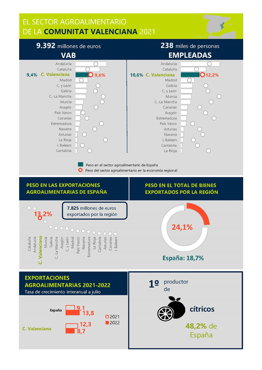 El sector agroalimentario valenciano es el tercero más importante en España, solo por detrás de Andalucía y Cataluña. Con un peso en la economía de 9.392 millones de euros en 2021, representa el 9,6 % del VAB agroalimentario de la región (incluidos el sector primario, la industria de la transformación y la distribución). En cuanto al empleo, el agroalimentario genera en la Comunitat Valenciana 237.848 puestos de trabajo, lo que supone el 12,2 % del total del empleo de la economía regional.