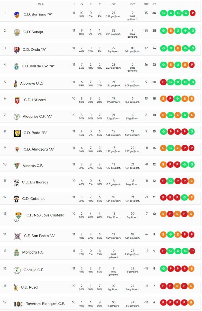 El CD Burriana perdió el primer partido de la temporada, aunque sigue líder del Grupo 1. Diversos partidos se vieron afectados por el temporal de lluvia, mientras que el partido que debía enfrentar al CD L’Alcora ante la UD Puzol se disputará el próximo miércoles, al haber jugado el equipo alcorino la eliminatoria de Copa el pasado sábado ante el Elche. Destaca entre los resultados de la jornada la contundente victoria del Onda frente al Almazora.