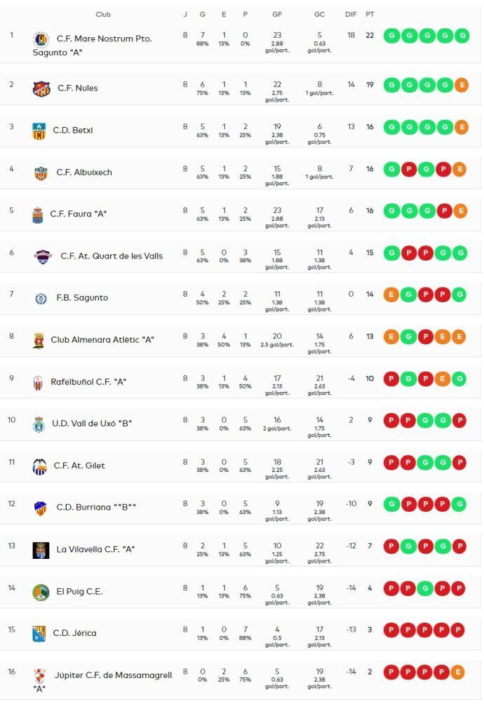 En cuanto al grupo 2 de la 1ª regional el CF Nules empató a 1 gol ante el CF Albuixech y el CD Betxí hizo lo propio ante el Almenara. La tabla de clasificación queda de esta manera.
