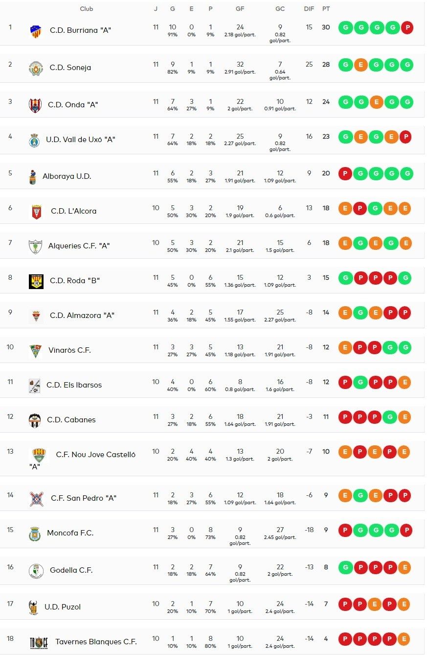El CD Burriana perdió el primer partido de la temporada, aunque sigue líder del Grupo 1. Diversos partidos se vieron afectados por el temporal de lluvia, mientras que el partido que debía enfrentar al CD L’Alcora ante la UD Puzol se disputará el próximo miércoles, al haber jugado el equipo alcorino la eliminatoria de Copa el pasado sábado ante el Elche. Destaca entre los resultados de la jornada la contundente victoria del Onda frente al Almazora.