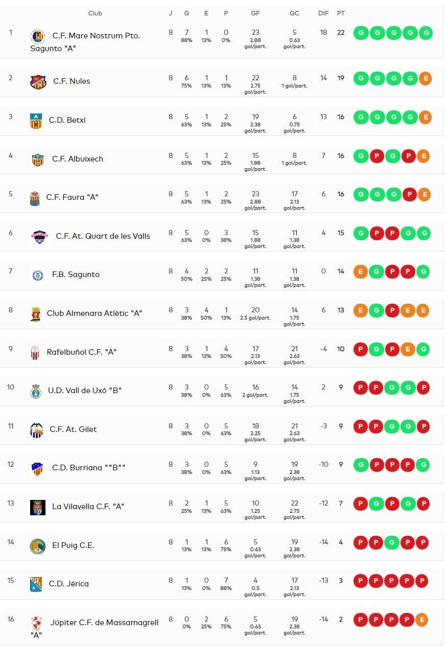 En cuanto al grupo 2 de la 1ª regional el CF Nules empató a 1 gol ante el CF Albuixech y el CD Betxí hizo lo propio ante el Almenara. La tabla de clasificación queda de esta manera.