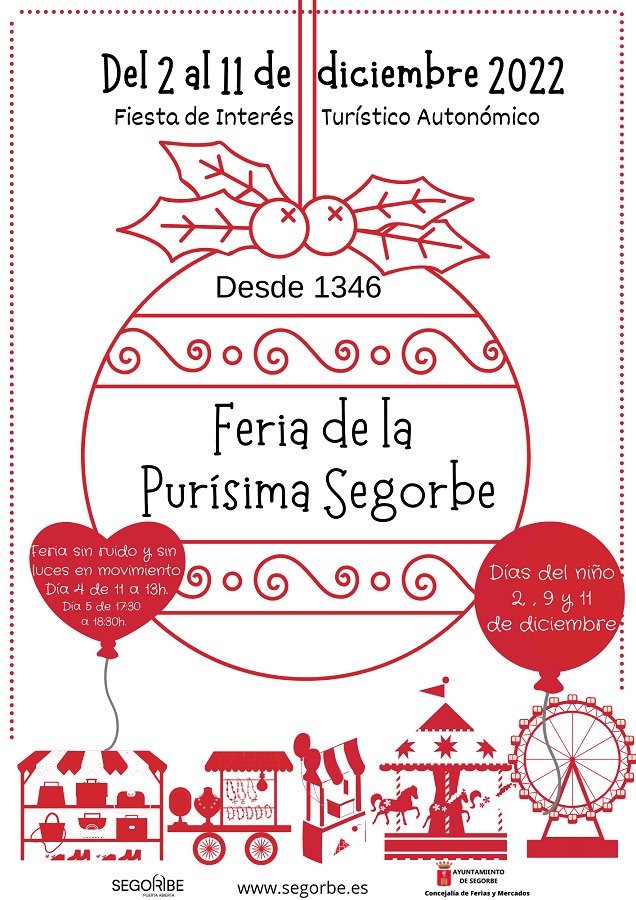 Segorbe celebrará el 8 de diciembre su tradicional Feria de la Purísima, Fiesta de Interés Turístico de la Comunidad Valenciana, que contará con atracciones y puestos de productos artesanales entre los días 2 y 11. El día 4, de 11 a 13 h., y el 5, de 17.30 a 18.30 h, se celebrará la “feria sin ruido y sin luces en movimiento”; y los días 2, 9 y 11, serán los Días del Niño.